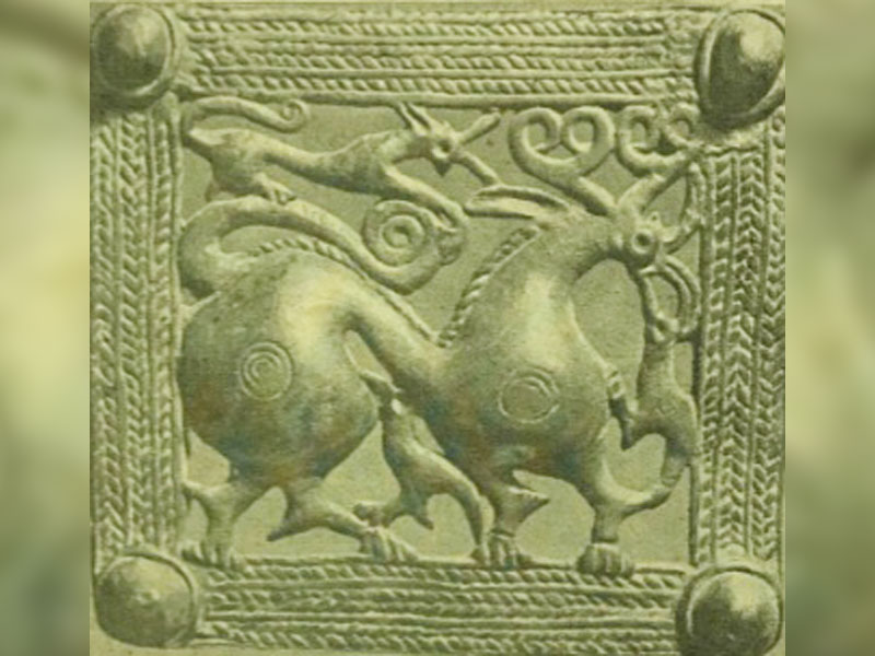 В 1936 г. в известном святилище Реком Е.Г. Пчелиной была найдена медная бляшка с изображением коня, передние ноги которого в виде столбика разделены внизу на два копытца; вместо задних ног у него – толстый спирально закрученный хвост. Между тем трехногий конь представлен в осетинском фольклоре вообще, в Нартовском эпосе, в частности.
